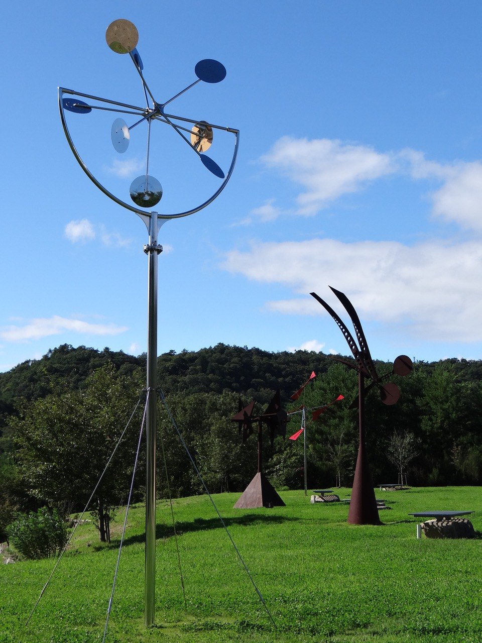 パリ、ミラノ、ニューヨークでも活躍している世界的な彫刻家 新宮晋氏の風や水で動く作品が屋外展示されています。 この「新宮晋 風のミュージアム」は、新宮晋氏の作品を一同に見ることの出来る、世界で初めての野外ミュージアムです。